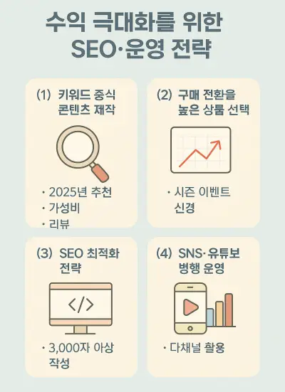 💰 핵심 포인트: 트래픽보다 구매 전환율이 중요하다. 즉, 단순 방문보다는 구매로 이어지는 콘텐츠 구조가 수익성을 결정한다.