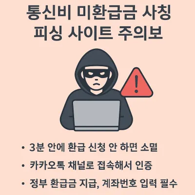최근에는 ‘통신비 환급금 받기’라는 문구로 사람들을 현혹하는 사칭 사이트와 문자 피싱도 증가하고 있습니다. ‘정부지원’, ‘최대 50만원 환급’ 등의 말로 유도하는 이 링크들은 정상적인 환급 절차와 무관하며, 개인정보 탈취를 목적으로 합니다.