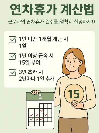 - 1년간 출근율 80% 이상 근로자 → 연차 15일
