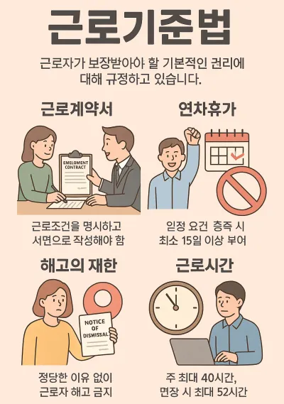 근로계약서 작성, 연차휴가 부여, 해고 통보, 근로시간 산정 등 직장 내 모든 노동 문제의 중심에는 근로기준법이 있습니다. 사업주는 법적 기준을 준수해야 하고, 근로자는 스스로 권리를 알고 증거를 확보해야 합니다.