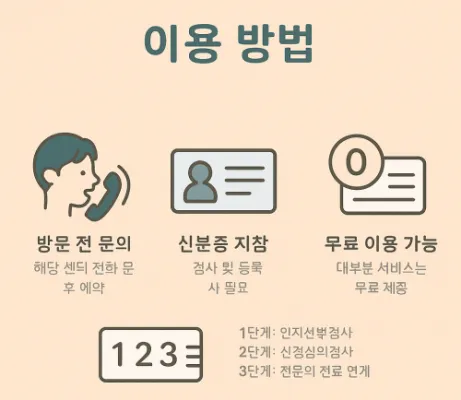 - 방문 전 문의: 해당 센터 전화 문의 후 방문 예약