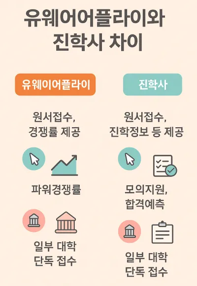 많은 수험생이 "유웨이와 진학사가 같은 기능을 하는 것 아닌가?"라고 묻는다. 실제로 유사한 기능을 제공하지만, 각 플랫폼의 강점은 조금 다르다.