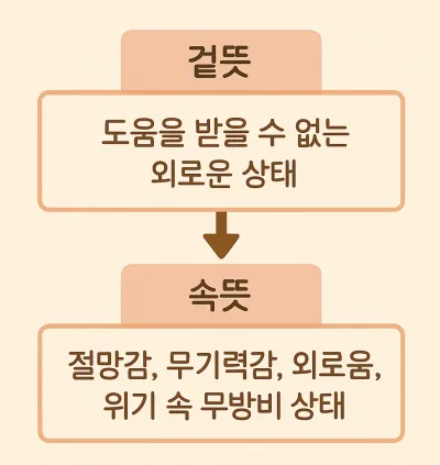 - 겉뜻: 눈에 보이는 고립 상태. 물리적 또는 사회적 지원이 차단된 상황을 나타냅니다.