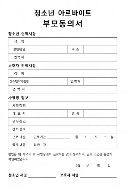 2025년 기준 최신 양식은 고용노동부 청소년근로권익센터 공식 사이트를 통해 무료로 다운로드할 수 있으며, 정해진 형식을 기준으로 작성하면 법적으로도 보호받을 수 있습니다. 부모와 함께 충분한 상담 후 서류를 꼼꼼히 작성하여, 청소년이 안전하고 정당한 환경에서 아르바이트를 경험할 수 있도록 합리적인 준비가 필요합니다.