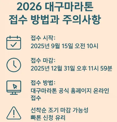 - 접수 방법: 대구마라톤 공식 홈페이지 온라인 접수