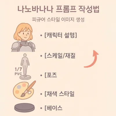 나노바나나는 특히 피규어 스타일 이미지 생성에서 강력한 성능을 보여줍니다. 단순히 “캐릭터 그림”이라고 입력하는 것보다 구체적인 피규어 표현 방식을 포함하면 훨씬 자연스러운 결과물이 나옵니다. 프롬프트 공식은 다음과 같습니다.