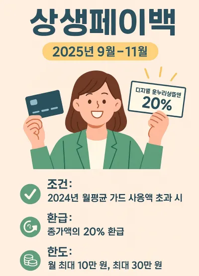 예를 들어, 2024년 월평균 카드 사용액이 100만 원이고 2025년 9월에 130만 원을 사용했다면, 증가분 30만 원의 20%인 6만 원을 디지털 온누리상품권으로 돌려받는다.
