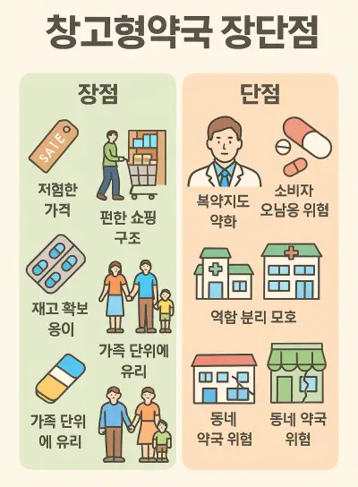 창고형약국은 가격·편의성·재고 안정성 등 장점이 분명하지만 동시에 복약지도 약화·약물 오남용 위험 등 해결해야 할 문제도 많다. 특히 지역 약국 생태계와의 균형을 위해 제도적 보완이 필요한 시점이다.