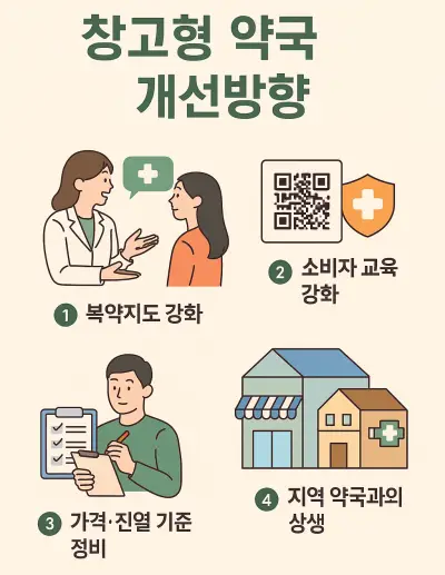 창고형 약국이 건강한 유통 모델로 자리 잡기 위해서는 다음과 같은 방향성이 요구된다.