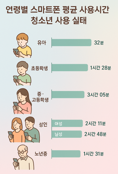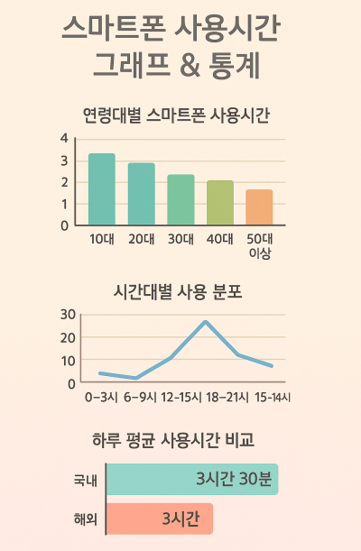최근 한국정보화진흥원의 조사 결과를 보면, 연령별 스마트폰 사용시간이 시각적으로도 명확하게 차이 납니다. 아래는 대표적인 사용시간 통계 예시입니다:
