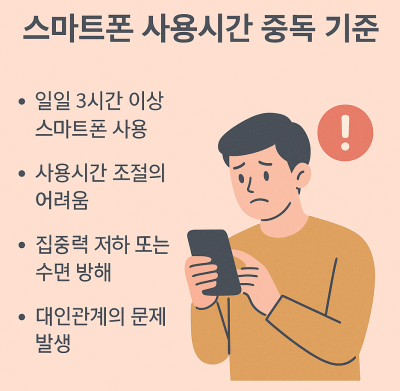 세계보건기구(WHO)와 미국정신의학회(APA)에서는 스마트폰 과의존을 디지털 행동 중독으로 간주하며, 12개월 이상 일상생활에 방해가 될 정도의 과도한 사용은 진단 기준에 포함될 수 있다고 봅니다. 특히 청소년의 경우, 하루 2시간 이상 스마트폰 사용은 문제 사용으로 분류되기도 합니다.