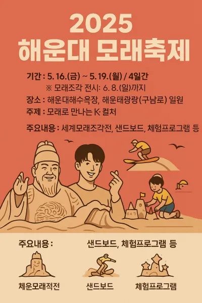 2025 해운대모래축제는 지역 행사 그 이상의 의미를 지니며, K-컬처와 관광, 예술이 결합된 대한민국 대표 봄 축제입니다. 이번 20주년을 맞아 더욱 풍성하게 구성된 해운대모래축제에서 예술과 체험, 감성 모두를 즐겨보세요. 지금 바로 일정 체크하고 떠날 준비를 시작하세요!