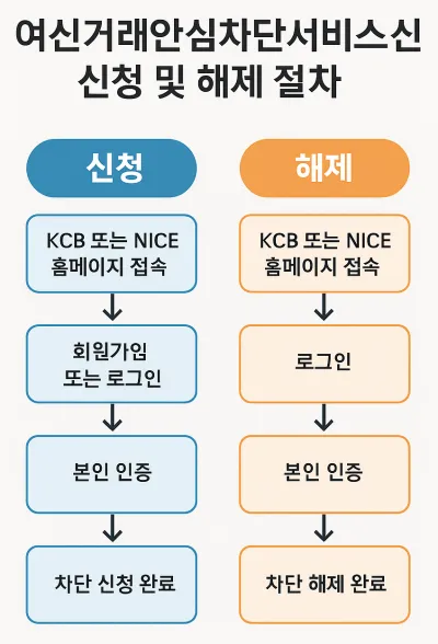여신거래안심차단서비스는 등록만큼 해제도 간편하게 가능하지만, 반드시 본인 명의로 본인 인증을 거쳐야 해제가 완료됩니다. 아래는 KCB와 NICE지키미를 통한 해제 절차입니다.