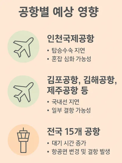 이 경우 탑승 수속이 지연되고 출입국 심사 대기 줄이 길어질 수 있으며, 국제 화물 처리 지연까지 이어질 수 있다.