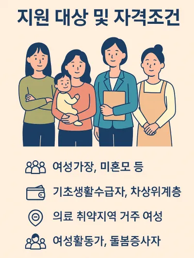 여성건강지원사업은 전국 공통 사업이 아니며, 지자체 또는 여성재단 공모사업 형태로 진행된다. 아래 기준은 대표적인 지원대상 예시이다.