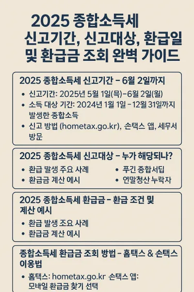 5월은 종합소득세 신고의 달입니다. 특히 프리랜서, 자영업자, 임대소득자 등 다양한 수입원이 있는 분들에게 2025 종합소득세 신고기간, 환급일, 환급금 조회 방법은 반드시 알아두어야 할 핵심 정보입니다. 국세청은 올해 신고기한을 **2025년 5월 1일(목)부터 6월 2일(월)**까지로 연장하였으며, 이번 포스팅에서는 환급 조건, 계산 예시, 조회 방법, 절세 전략까지 한눈에 정리해드립니다.