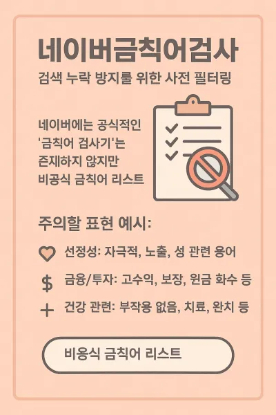 네이버에는 공식적인 "금칙어 검사기"는 존재하지 않지만, 블로그 운영자 사이에서는 금칙어로 인해 검색 누락되는 사례가 빈번히 보고되고 있습니다. 따라서 네이버금칙어검사란 표현은 일종의 사전 필터링 작업으로 이해할 수 있으며, 이는 블로그 글이 검색 반영에서 제외되지 않도록 하기 위해 매우 중요합니다.