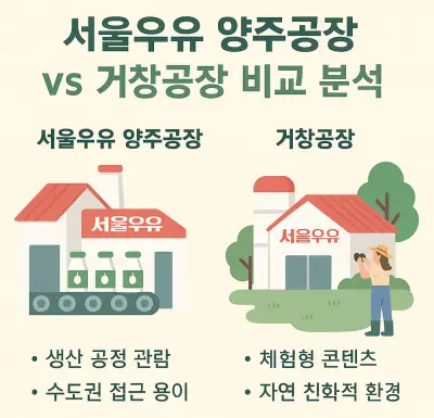 서울우유 양주공장 견학은 체계적·관찰형 견학에, 서울우유 거창공장 견학은 체험 중심 견학에 적합하니 방문 목적에 맞게 선택하면 최고의 만족을 얻을 수 있다.