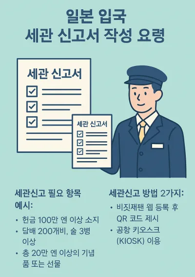 세관 신고는 '소지품이 면세 범위를 초과하는가'에 따라 달라집니다. 이전에는 종이 양식으로 작성해야 했지만, 현재는 비짓재팬 웹 등록 또는 공항 KIOSK 사용으로 전자 신고가 가능합니다.
