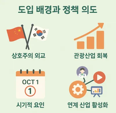 먼저 경제적 측면에서 중국인 관광객은 한국 관광시장에서 차지하는 비중이 매우 크다. 코로나19 이전 방한 외래 관광객의 약 30%가 중국인이었고, 이들의 소비 규모는 연간 수조 원에 달했다. 숙박업, 면세점, 전통시장, 외식업계는 중국인 관광객 유입에 따라 매출이 크게 좌우되는 구조였다. 따라서 정부가 경기 부양과 소비 회복을 위해 이 제도를 도입한 것은 충분히 설명 가능하다.
