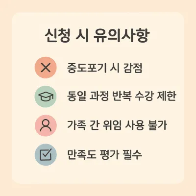 또한, 평생교육바우처는 중복 신청이 불가하며, 내일배움카드와 혼용 사용이 제한될 수 있으므로 반드시 지원 제도 간 중복 여부를 확인해야 합니다.