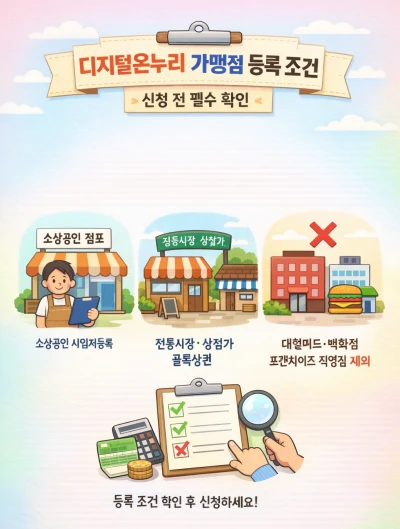 디지털온누리 가맹점 등록 조건은 비교적 명확하다. 기본적으로 사업자등록증을 보유한 소상공인이어야 하며, 전통시장·상점가·골목상권 중심 점포가 대상이다.