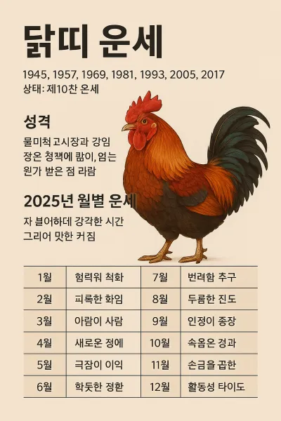 2025년 갑진년(청룡의 해)을 맞아 닭띠의 성격과 띠별 궁합, 올해의 전반적인 운세까지 살펴보는 종합 가이드를 준비했습니다. 특히 닭띠 남녀 성격 차이, 월별 운세 흐름, 닭띠 아이 양육 팁, 유명인 사례까지 폭넓게 다뤄 누구나 쉽게 이해하고 활용할 수 있도록 구성했습니다.